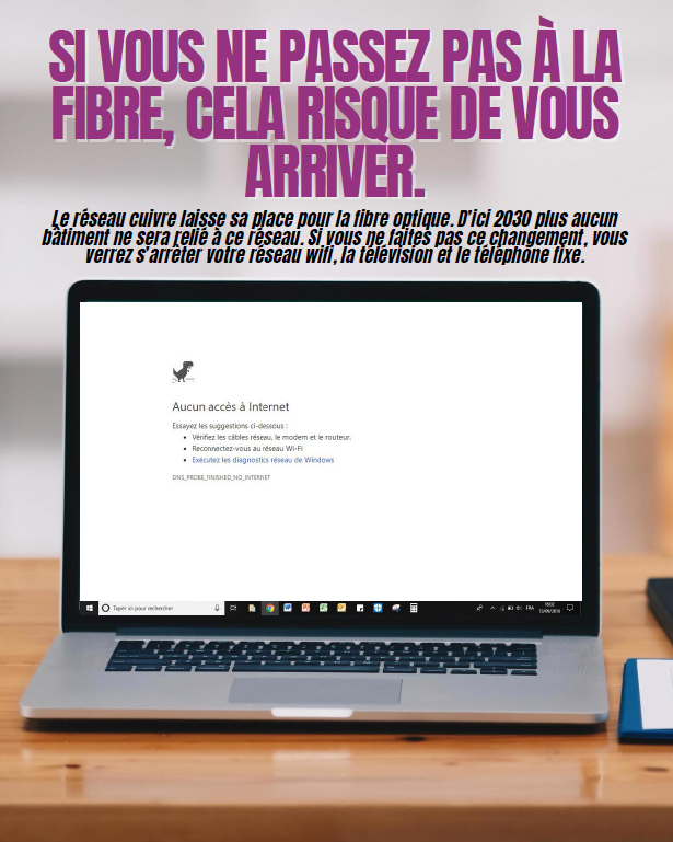 Cela signifie que d’ici là, si vous ne l’avez pas encore fait, vous devrez vous abonner à la fibre optique avec un téléphone fixe fonctionnant avec une box (abandon de l’ADSL et de la prise de téléphone murale de votre logement). Il n’y a pas d’urgence, il vous reste 1 ans et demi pour le faire.